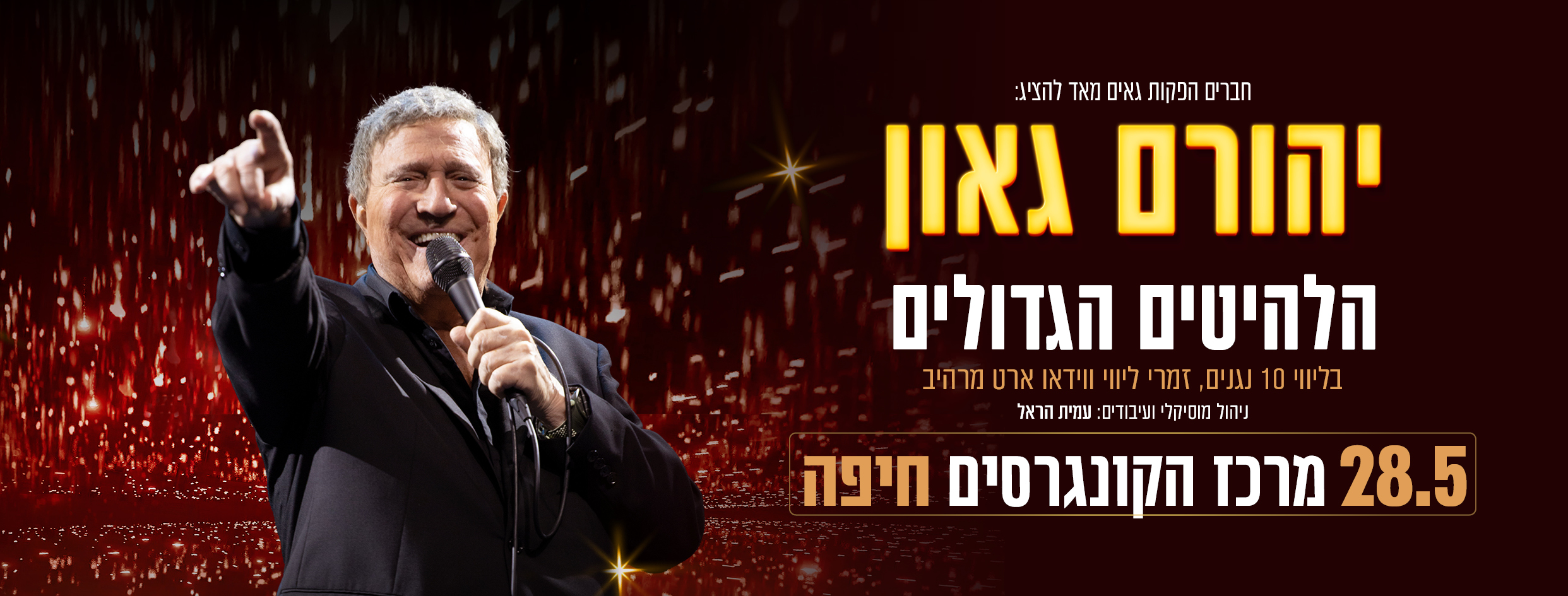 יהורם גאון בהופעה הלהיטים הגדולים מופע חדש בליווי 10 נגנים וזמרי ליווי בשילוב V.J מרשים והלהיטים הגדולים מכל השנים : הנני כאן,השר מונטיפיורי,ארץ נהדרת,כמו חצב,רוזה, אלף נשיקות,עוד לא אהבתי די ועוד… ועוד…